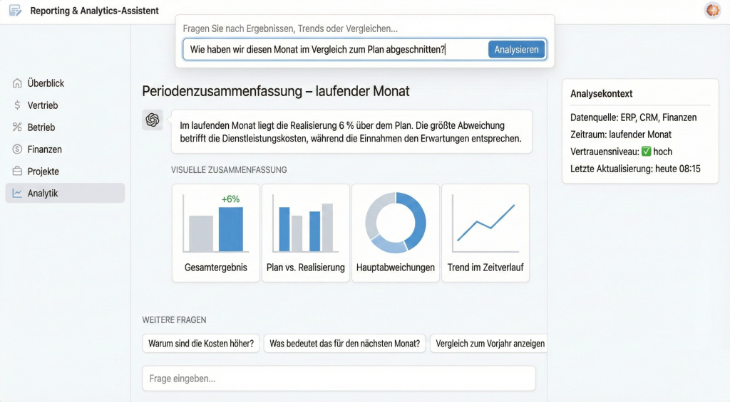 Daten-Assistent: Beantwortet Fragen zu Zahlen, Umsätzen, Projekten in natürlicher Sprache.