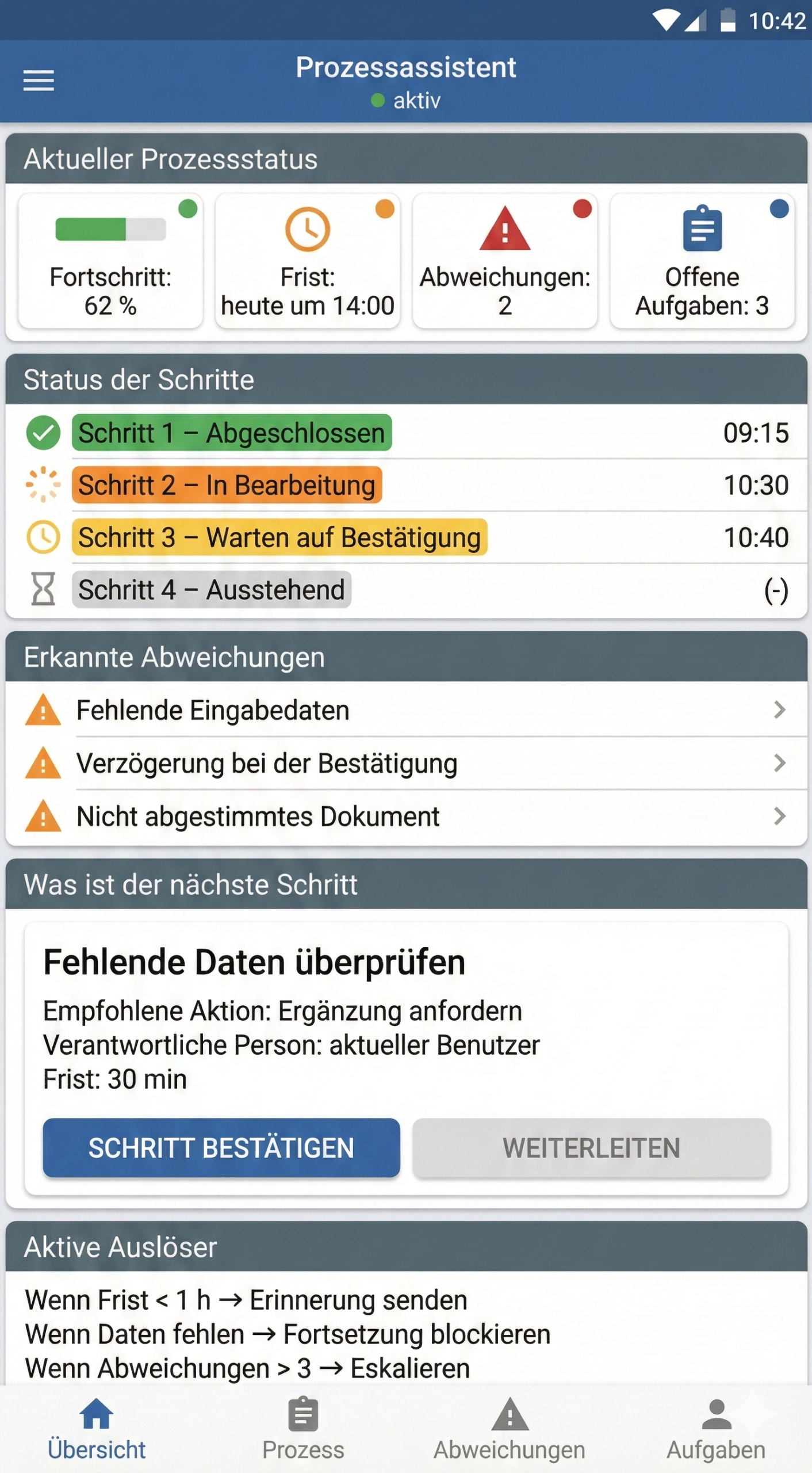 Visuelle Kontroll-Dashboards für Prozesse: einfache Darstellungen von KPIs, Status, Abweichungen und Triggern, bei denen klar ist, „was passiert“ und „was der nächste Schritt ist“.
